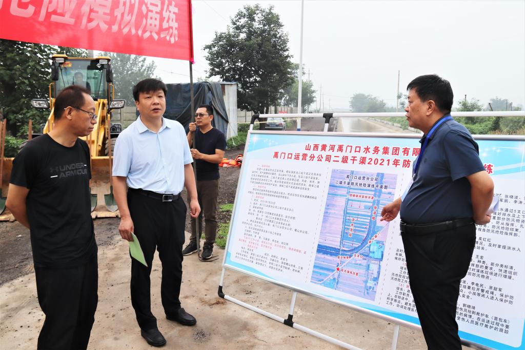 7月20日,禹門口集團公司組織干部職工在禹門口二級干渠開展防汛搶險模擬演練。萬家寨水控集團黨委委員、副總經理常建忠,集團黨史學習教育第十巡回指導組全體成員參加演練。